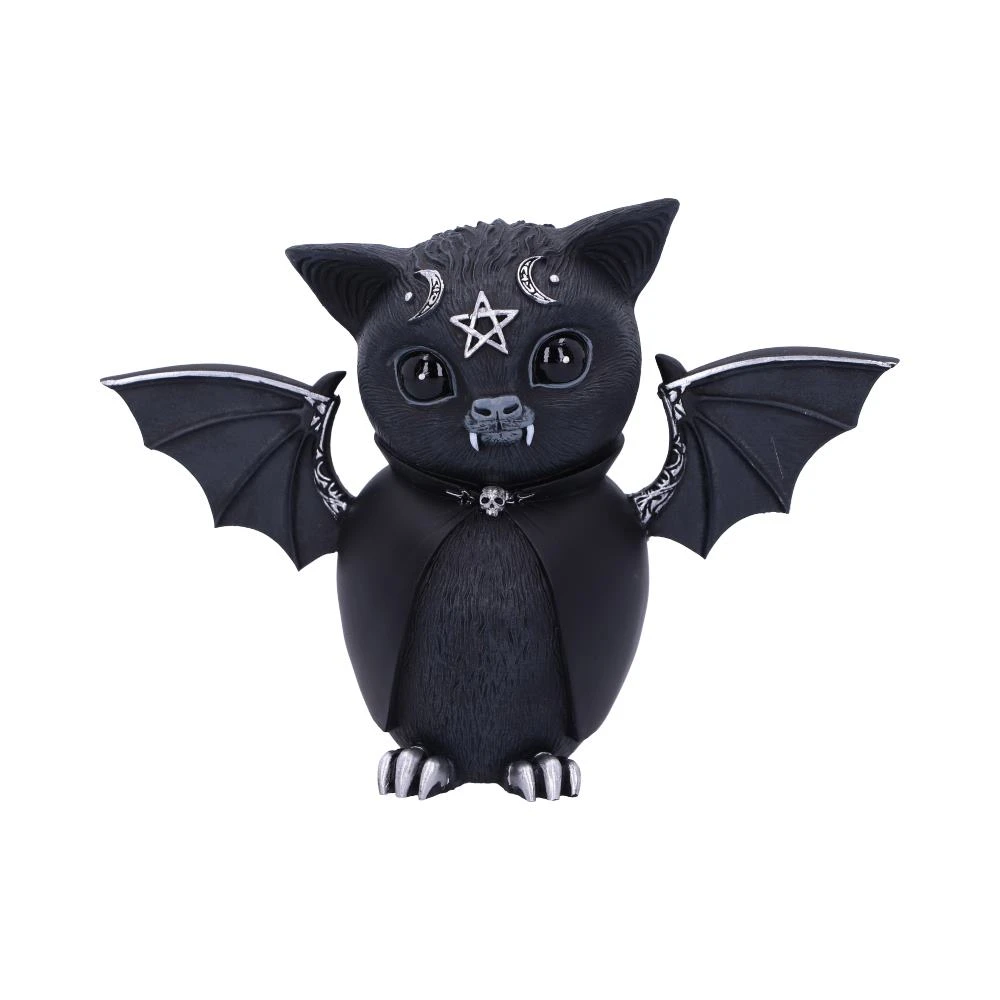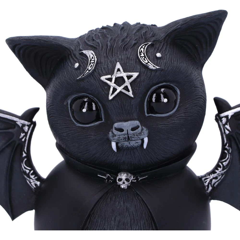This strange creature is the union of good and evil. As you look into its black eyes you notice that all is not as it seems, darkness resides within. Inside of this bat appears to be a vampire spirit, encapsulated with abnormally large fangs and a black cape. The bat is decorated in ornate silver detailing and satanic symbology. Cast in high-quality resin and carefully hand-painted this figurine is likely to be the cutest occultist you’ve ever seen.