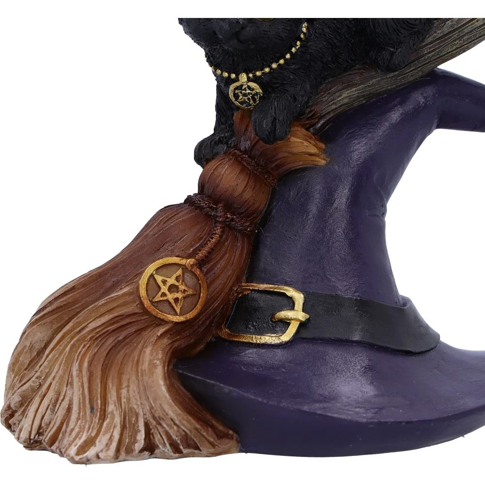 A playful black kitty climbs atop a small broom which is supported by a purple witches hat. Cast in the finest resin before being expertly hand-painted, this feline figurine is the perfect addition to any alternative home or witchcraft collection.