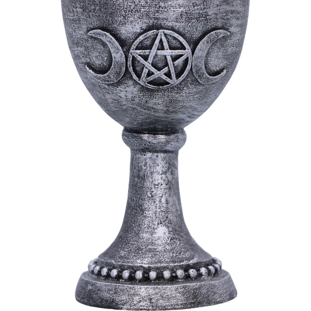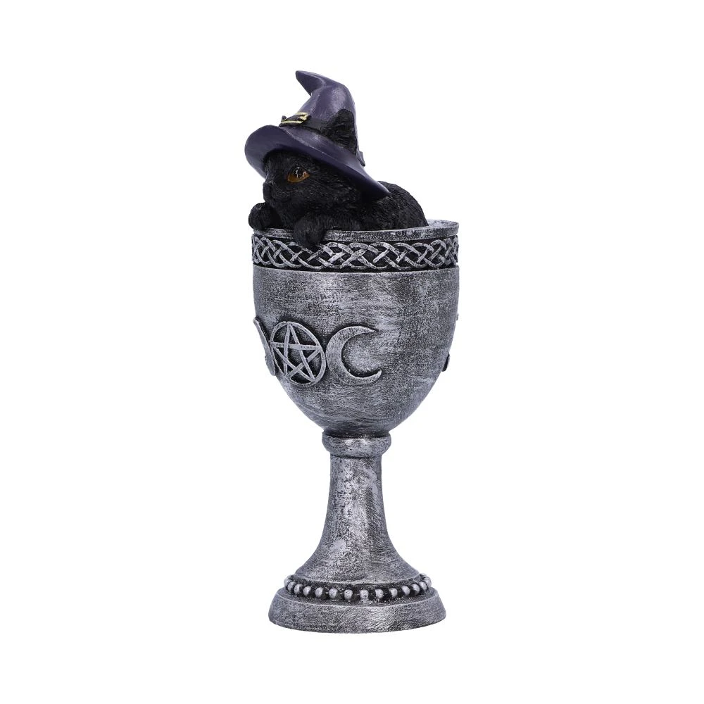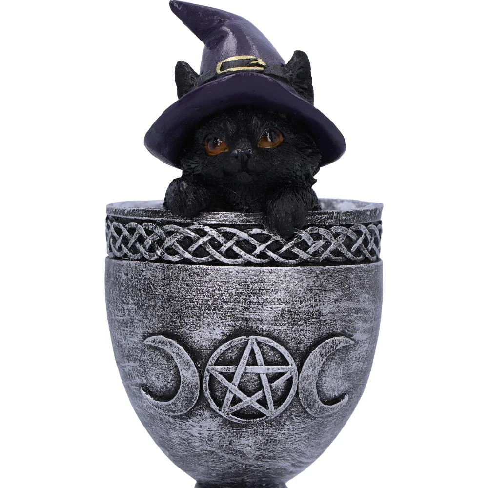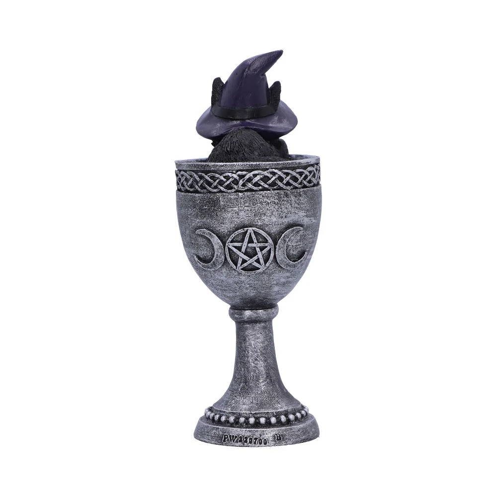 A black cat wearing a purple witch’s hat emerges from a silver goblet decorated with wiccan symbols. Cast in the finest resin before being expertly hand-painted, this feline figurine is the perfect addition to any alternative home or witchcraft collection.