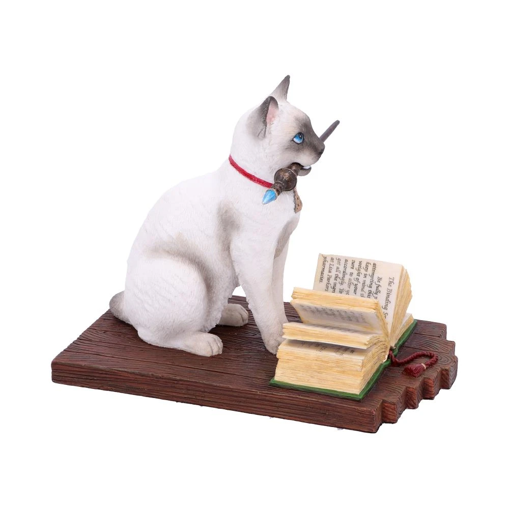 From the untamed imagination of Lisa Parker, this beautiful figurine is available exclusively through Nemesis Now. Not just your ordinary moggy this Blue Point Siamese wears a red collar, decorated with a triquetra talisman. Sat on a wooden perch, this familiar has a crystal wand grasped firmly between her small fangs as her icy blue eyes stare straight ahead. A spellbook sits open in front of her, the page reads “The Binding Spell. Be fully prepared before attempting this powerful spell. Keep in mind the size and weight of your subject and be sure to alter your quantities accordingly. You will be able to get all the ingredients required at Lisa Parker’s magical pharmacies. There you will find a vast array of powerful potions and spells, simply the best in the business! Purchase the following ingredients, 2oz of dragons blood, five white candles, organic silk woven cord, lavender, Irish Charcoal and corn”. Cast in the finest resin before being expertly hand-painted, the beautiful detailing enhances the magic of the piece, making it the perfect addition to any bewitching collection.
