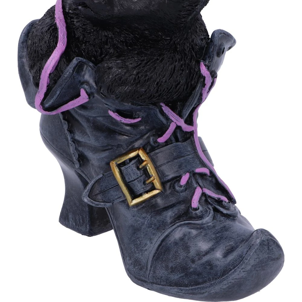 Het kleine zwarte poesje draagt een scheve zwarte heksenhoed terwijl het zich vastklampt aan de veters van de laars. Dit schattige beeldje is gegoten in hars van hoge kwaliteit en met de hand beschilderd. Het is het perfecte geschenk voor elke kattenliefhebber.