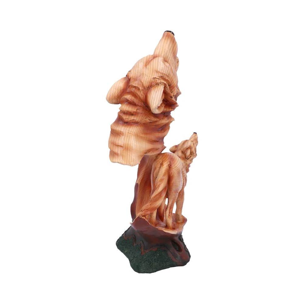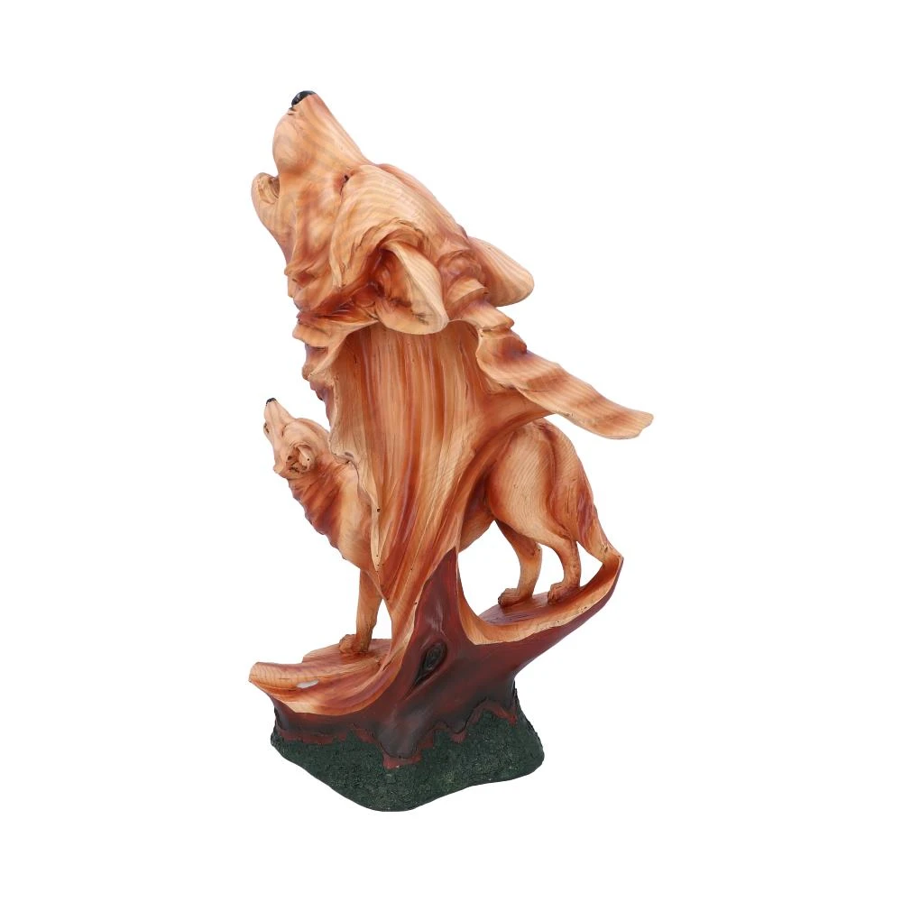 Carved out of wood are these two luxuriant wolves. Carved higher-up the piece is a wolf bust., the wolf howls upwards towards the moon. Beneath it, stands the wolf in its entirety, howling upwards. Cast in the finest resin before being carefully hand-painted to produce a realistic wood-effect. This statue is the perfect decorative piece for any wolf admirer.