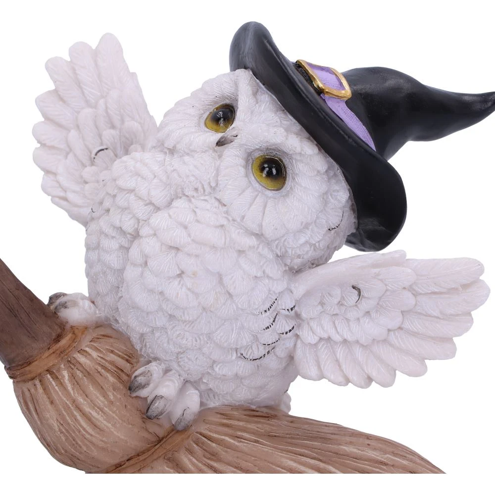 This adorable Snowy Flight owl figurine comes filled with the promise of magic. Seen sat ontop of a broom wearing a pointed black witches hat, this owl is ready to take flight. Cast in the finest resin before being expertly hand-painted, this piece will look great on any altar, bookshelf or mantel.