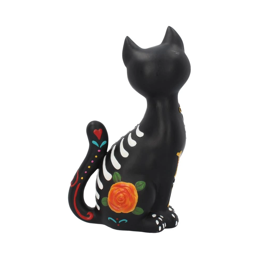 Enjoy Dia de los Muertos with this cute companion! Sitting upright, tail curling up in delight, this black cat looks to their left, a bone-white mask covering their face. Their body is covered in colourful patterns and designs of flowers, love hearts and bones, standing out in stark contrast to their jet-black body and making them look like a Mexican calavera. Cast in the finest resin before being lovingly hand-painted, this piece comes from alternative masters Nemesis Now.
