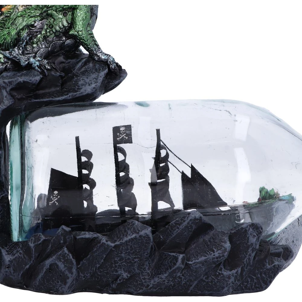The Adventure features a majestic green dragon who sits atop a rock clifftop looking down on the glass bottle beneath which has a black pirate ship captured inside. At the neck of the bottle is a small dragonling nestled in half of its egg shell, waiting for the right moment to crawl out and enter the realm. Cast in the finest resin before being expertly hand-painted, this figurine is perfect for any fantasy lover.