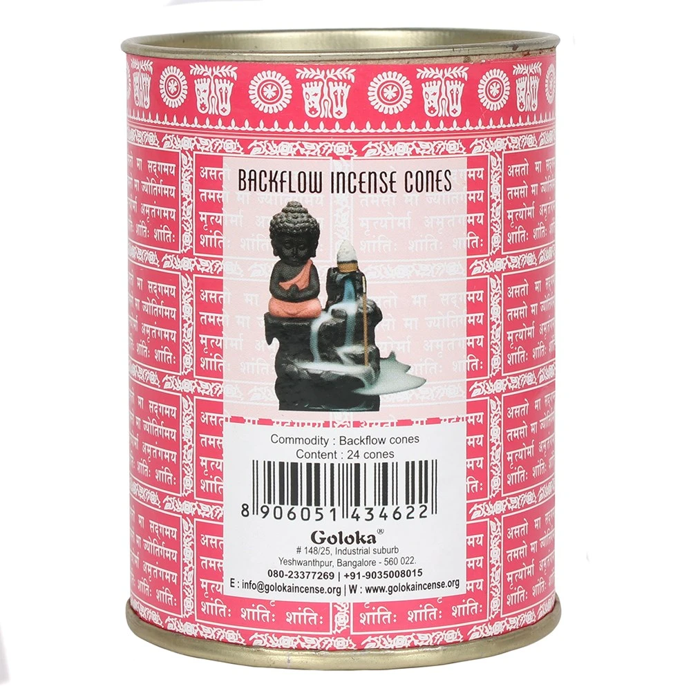 Deze Goloka Rose backflow wierookkegeltjes worden geleverd in een handig hersluitbaar blik. Er zitten 24 kegels in elk blik met een brandtijd van ongeveer 20 minuten per kegel.