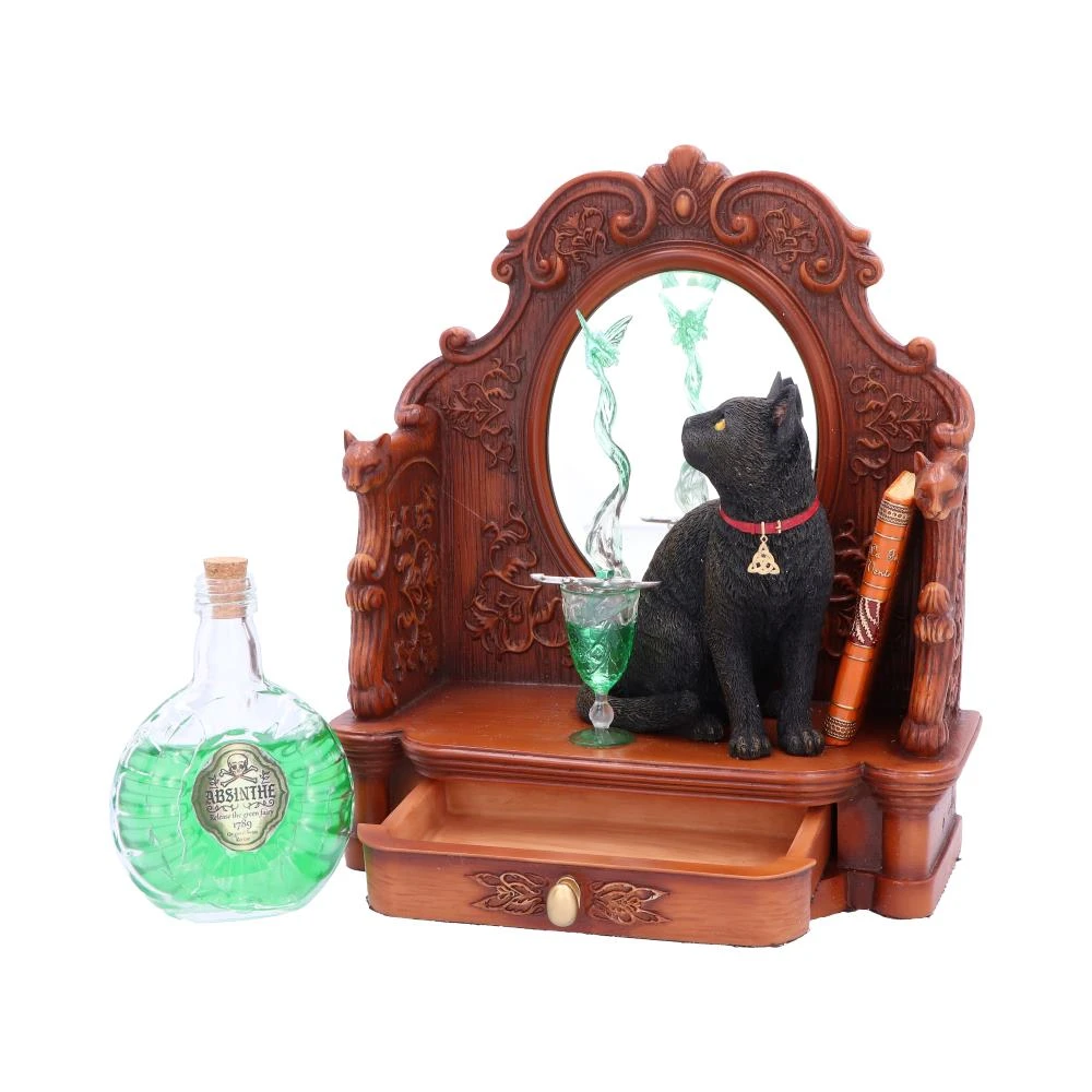 Lisa Parker is back with her favorite black cat, as it sits on antique dressing table with a removable drawer decorated with ornate detailing. The cat dons a silver triquetra color attached to a red collar. Next to the cat is Pontarlier absinthe glass, next to it is a removable Absithe bottle filled with the potent green liquid. All the while the cat stares at the translucent green fairy as it soars out of the absinthe.