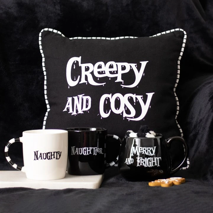 Show off your mischievous side with a spooky set of mugs. This creepy take on classic Christmas features ‘Naughty’ and ‘Naughtier’ text with matching back and white striped handles. Perfect for troublemaking couples and wicked pairs! 350ml capacity per mug. Microwave safe. Part of the Creepy Christmas range of gothic seasonal gifts and home decor.