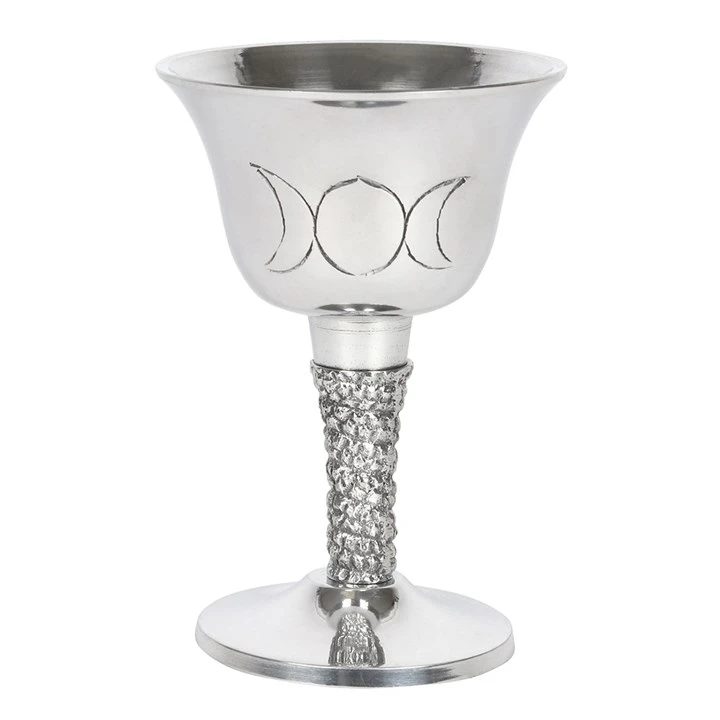 This silver metal chalice features a handcarved triple moon design and twisted vine accent along the stem. Symbolic of the goddess’ womb, this shining goblet is perfect for holding wine during sacred rituals.