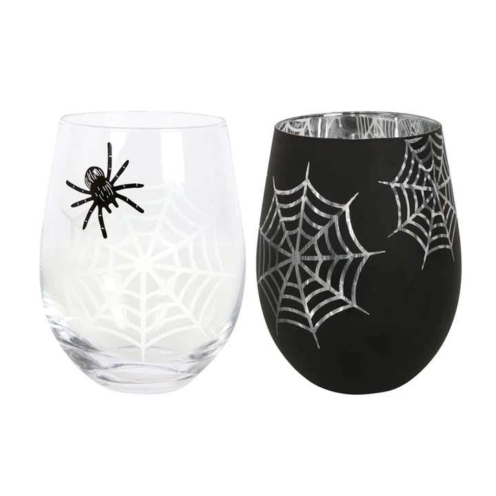 Have your wine and drink it, too! This set of 2 stemless glasses is perfect for nights of mischief. Designs feature a printed spider and his web (clear glass) and an eye-catching web silhouette with a silver interior (black). 500ml capacity each. Hand wash only. Do not microwave. Part of the Dark Lair range of gothic bat and spider giftware.