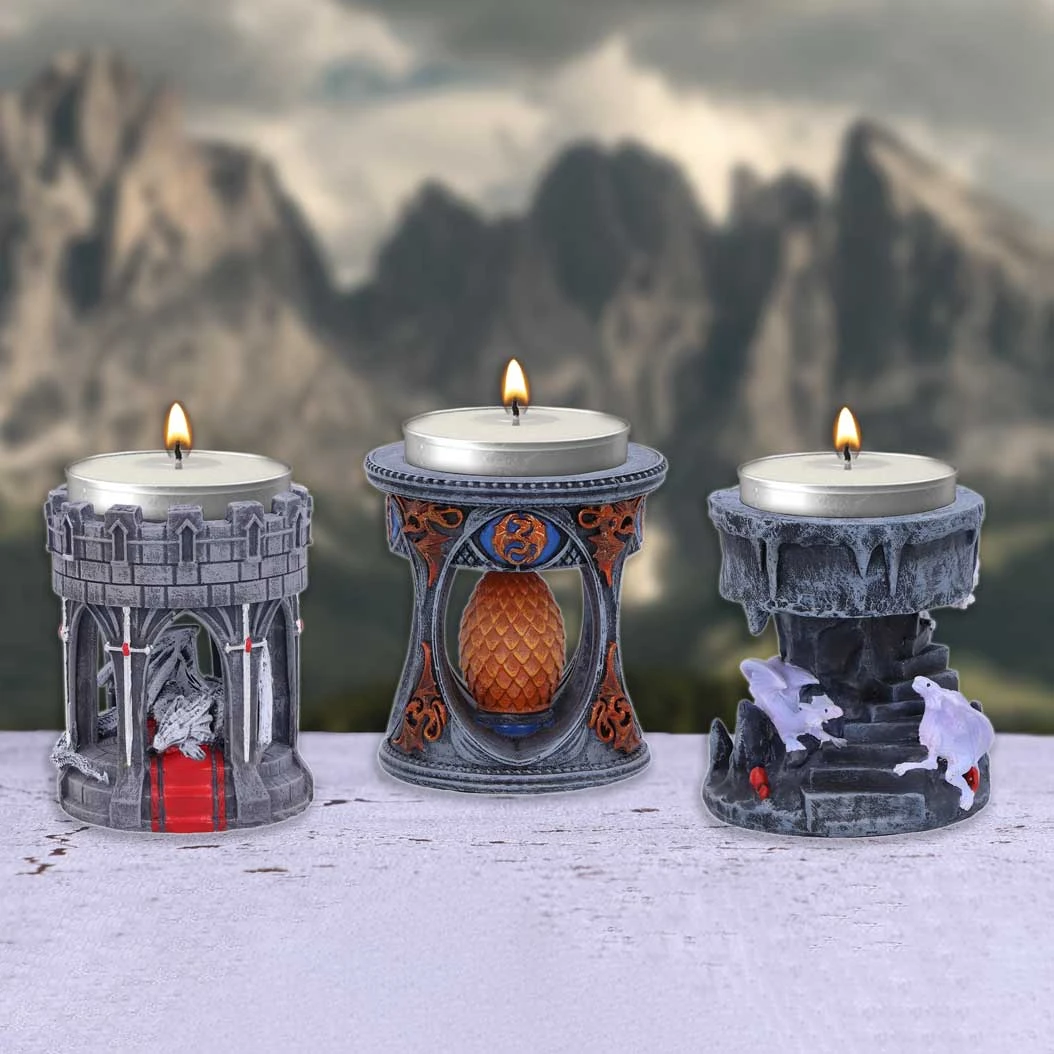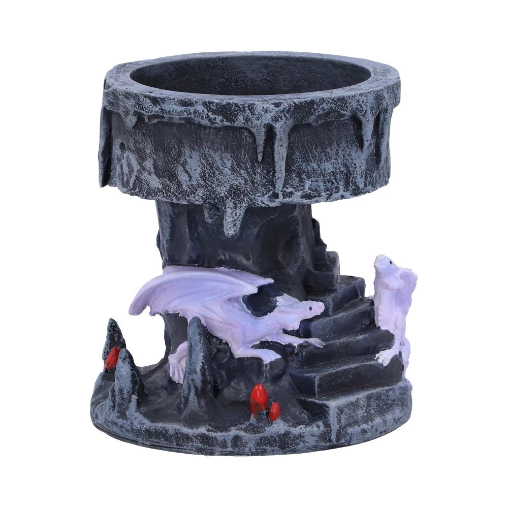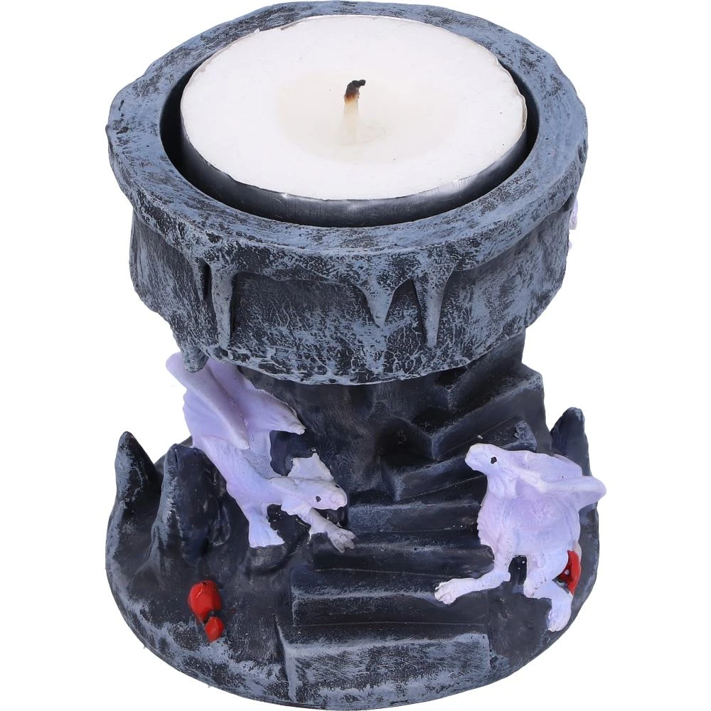 From the imagination of world renowned gothic and fantasy artist Anne Stokes, this Dragon Mage Tea Light is inspired by part of her Dragon Mage artwork. Two violet dragons curl around the rocky steps of the holder whilst glowing ruby red crystals emerge from behind the rock crevices. Cast in the finest resin before being expertly hand-painted, this Tea Light Holder will be the perfect addition to any gothic or fantasy themed space.