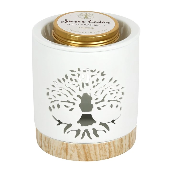 Fragrance the home with this elegant Tree of Life wax warmer gift set. A white ceramic burner is accented by a wood-effect base and a stunning Tree of Life cut out design. Set includes a tin of eco soy wax melts in the scent ‘Sweet Cedar’ that exudes the feeling of forest walks and cabin getaways.
