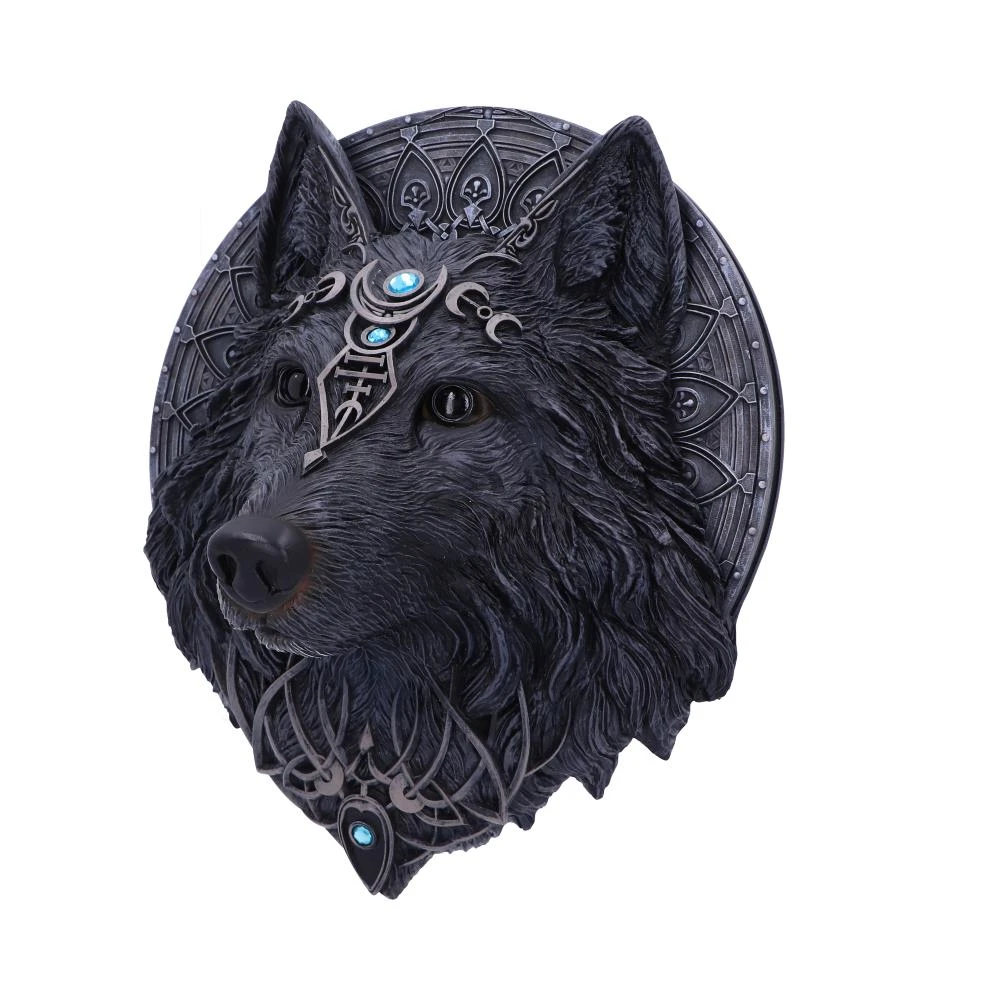 Forged in the minds of their ethereal creative team, this exclusive wall plaque was created by alternative giftware brand Nemesis Now. Modelled on the face of the dark Wolf, this beautiful creature stares straight ahead, piercing the souls of all who catch its gaze. Channelling the spirit of the wolf moon, this beast has the lunar phases emblazoned across its head to the bridge of its nose. Aquamarine jewels give a soft glow to an otherwise dark sculpture. Cast in the finest resin before being hand-painted, this large piece would make a bold display piece for any alternative home.
